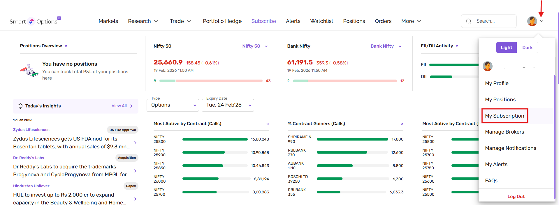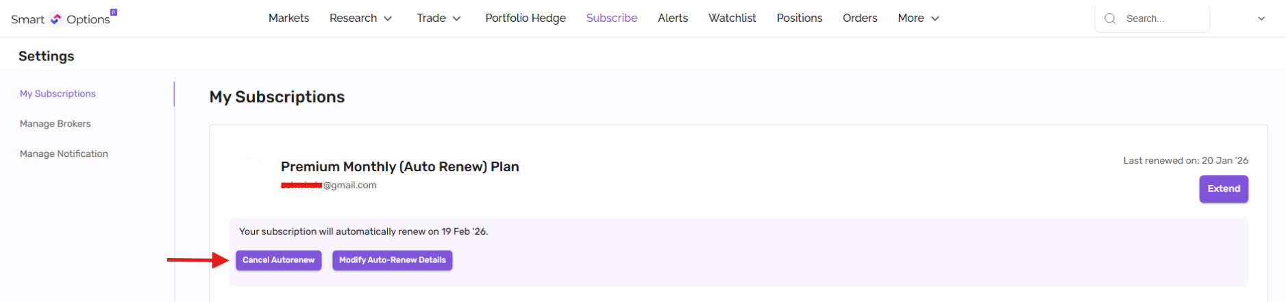 1. Go to the My Subscriptions page from the profile icon dropdown on the SmartOptions website.