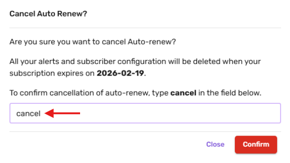 3. In the confirmation pop-up, type "cancel" in lowercase in the designated field and click "Confirm" to finalize the cancellation.