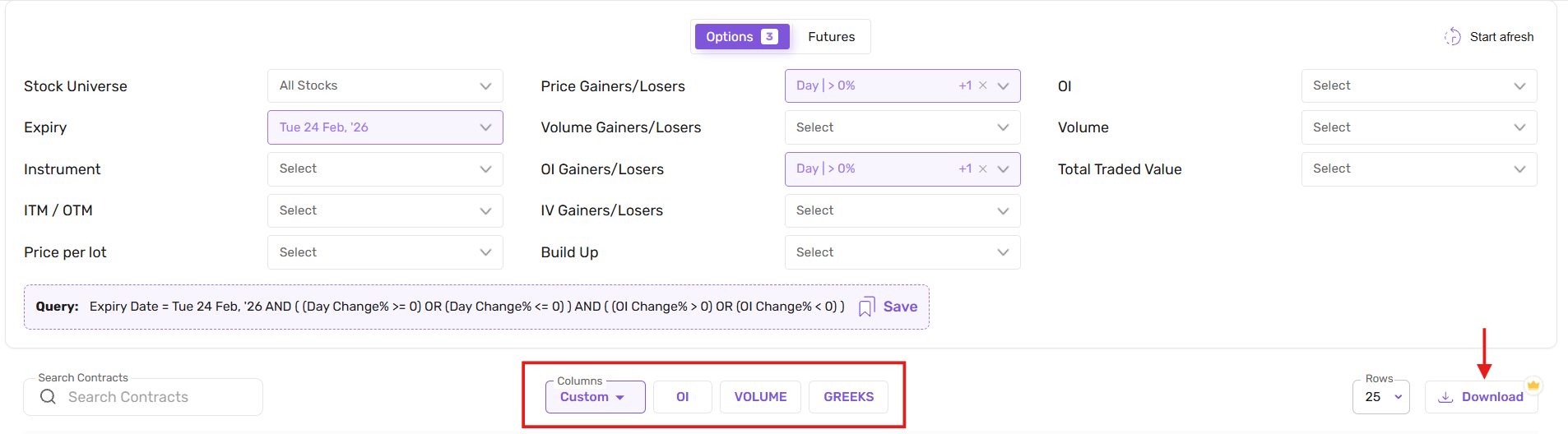 After selecting filters, you can customize the column headers displayed in the results table using the custom column dropdown. This allows you to choose which data points you want to view for the filtered contracts.
