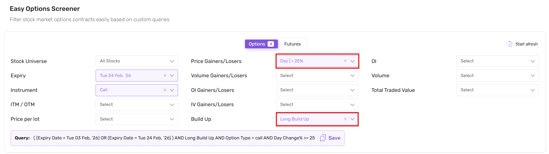 Select Price Gainers along with Long Build Up. This may help you spot contracts where both price and open interest are increasing.