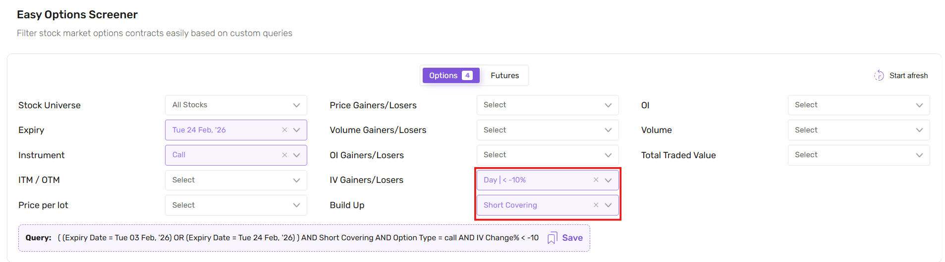 Select Short Covering along with IV Losers (declining Implied Volatility). This may indicate that existing short positions are being covered.